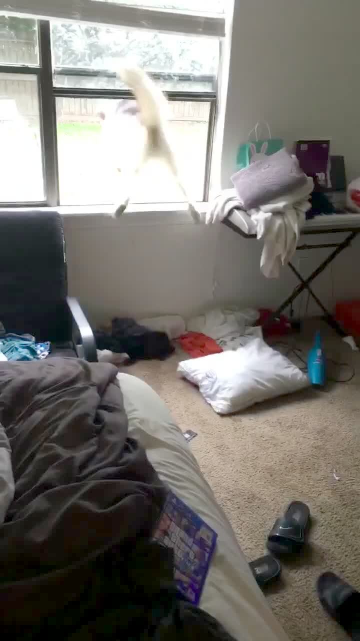 A man films a destroyed feather pillow in a bedroom and asks two black Labrador dogs if they did it and one of the dogs has feathers all over its face in a house.