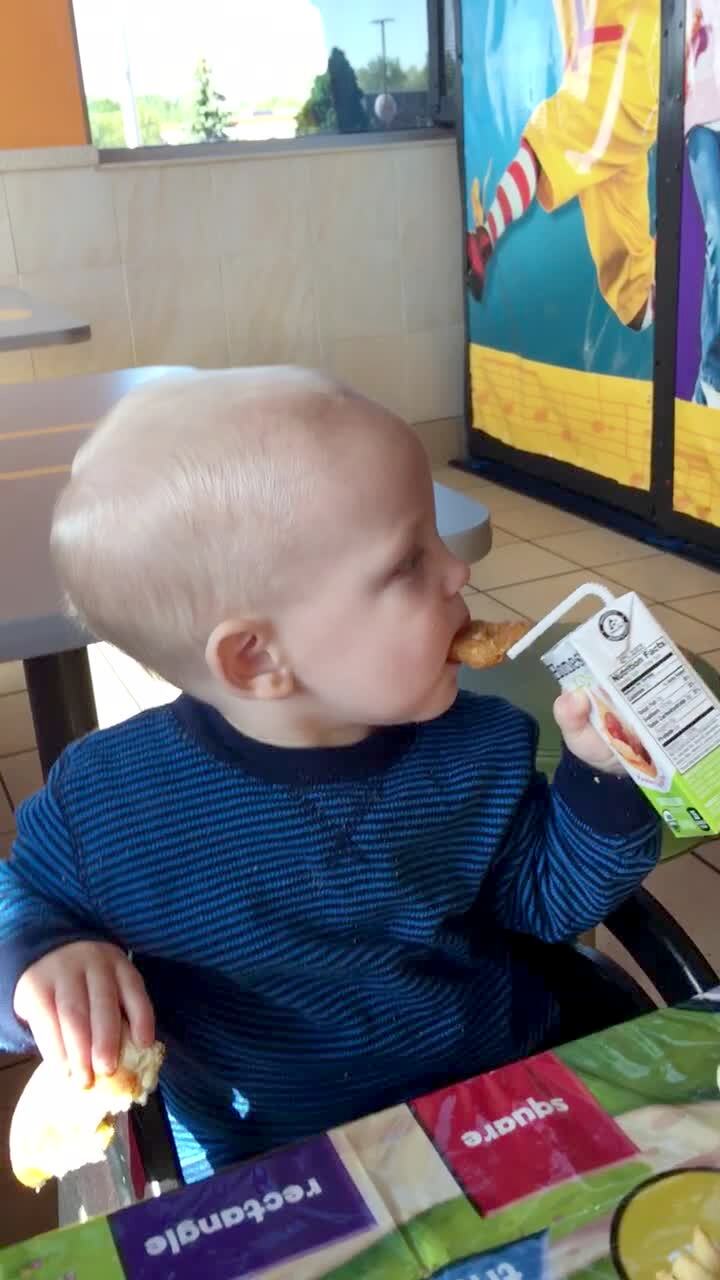 A baby boy tries to drink out of a juice box as he eats a chicken nugget but cannot fit both in his mouth.