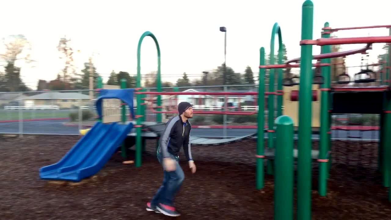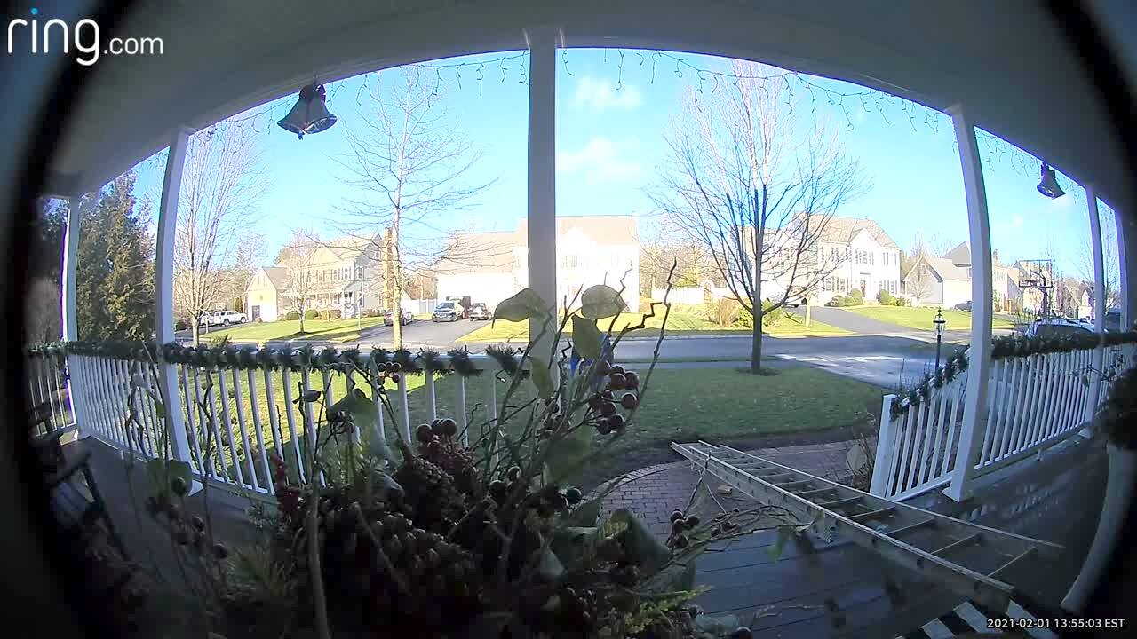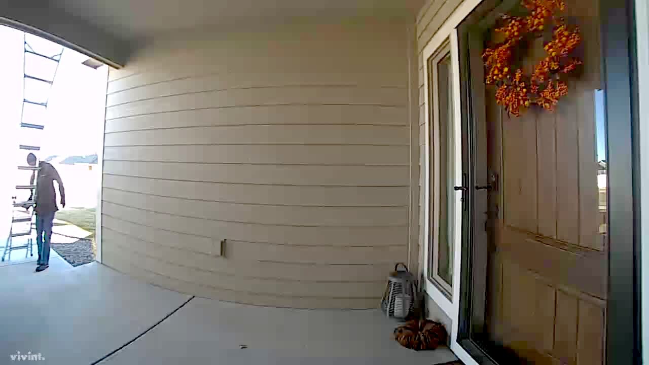 A man stands on a ladder in front of a house, then it slides down and falls on the porch steps and he lands on his feet. He whistles in relief. Security camera footage.