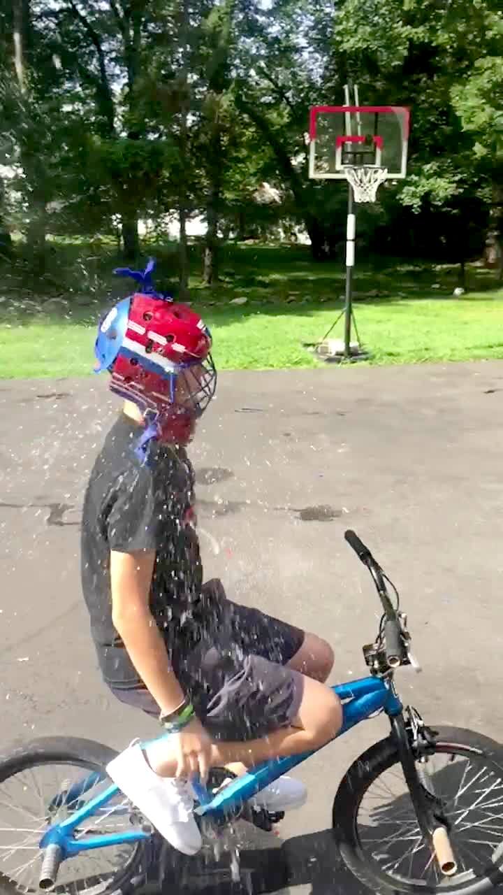 A young boy rides a bike and wears a helmet then gets hit in the face with a water balloon in slo-mo