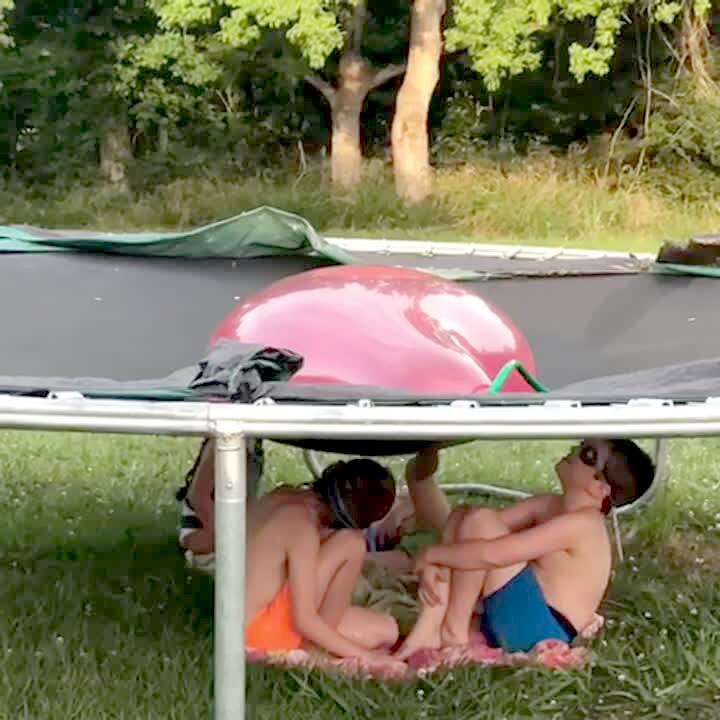 A water balloon fills up with a hose on the trampoline while a group of kids sit under the trampoline. The balloon explodes in slow motion and the water pours out on the kids.