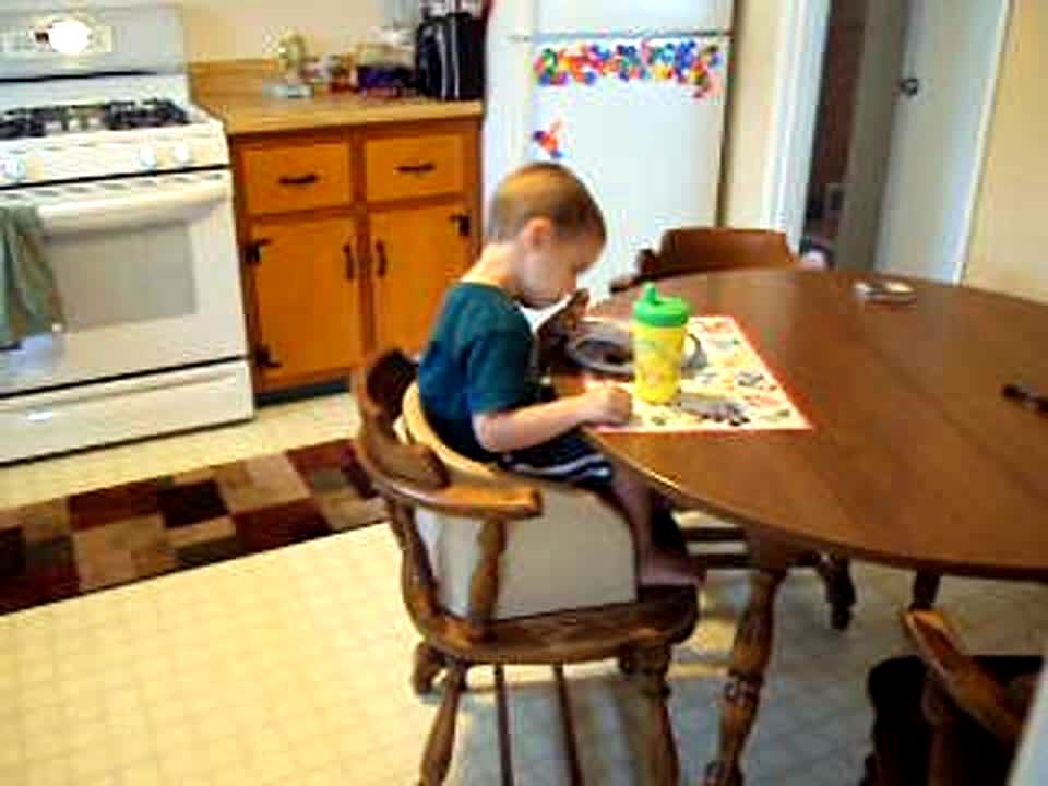 Tot boy falls asleep while sitting in a booster seat at the kitchen table. His head bobs up & down then smacks into a sippy cup. When the cup rolls off the table onto the floor, boy cries.