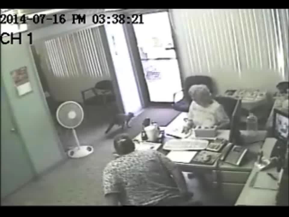 A raccoon falls through a ceiling and runs around a office space. Two women stand up and run out of the office as the raccoon runs all over the place. The raccoon eventually finds the door and runs outside.