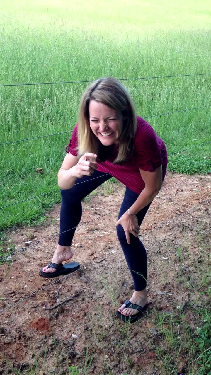 A woman at the beach tries to do a cartwheel but she stumbles and falls into the water.