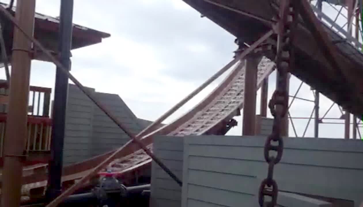A water/ log ride at a theme park splashes a young girl and knocks her over.