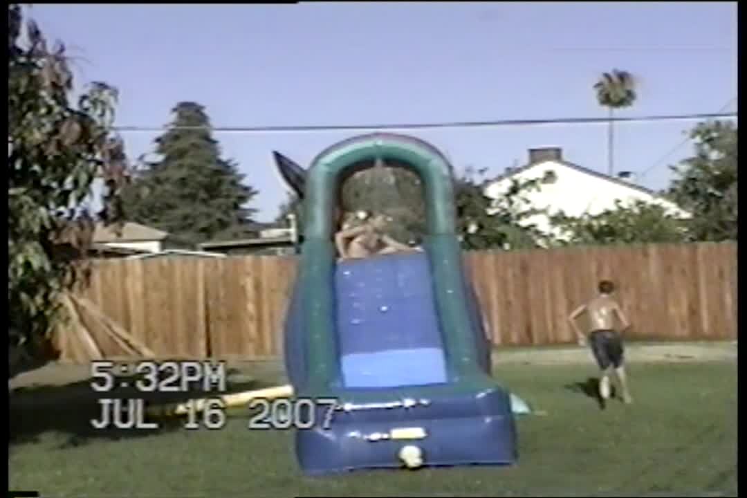 A boy and a girl are riding down a play set slide outdoors. Their grandmother tries to climb on to ride with them and tilts the entire play set over, falling, at 2:00.