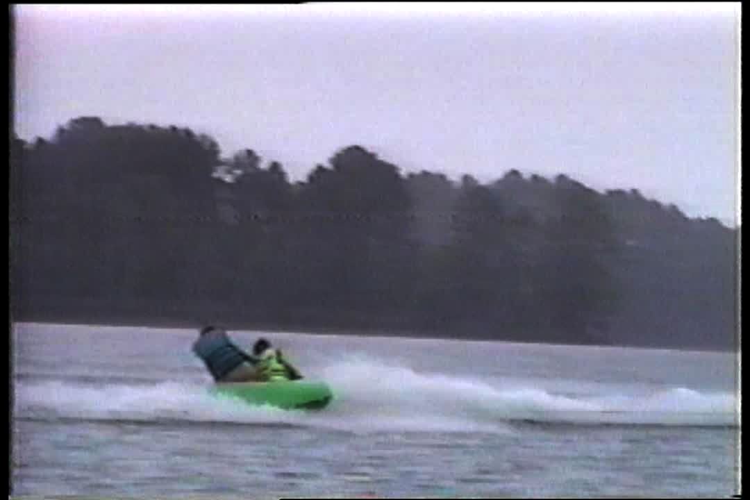 Various people slide down a wet plastic sheet into water- most of them fall off before they hit the water.