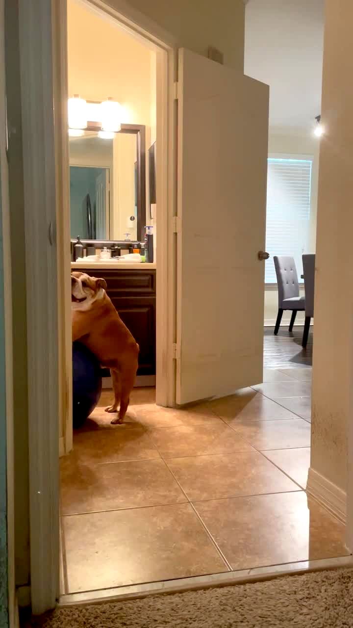 A Boxer dog squats and wiggles his hind legs and butt as his owner scratches his butt.