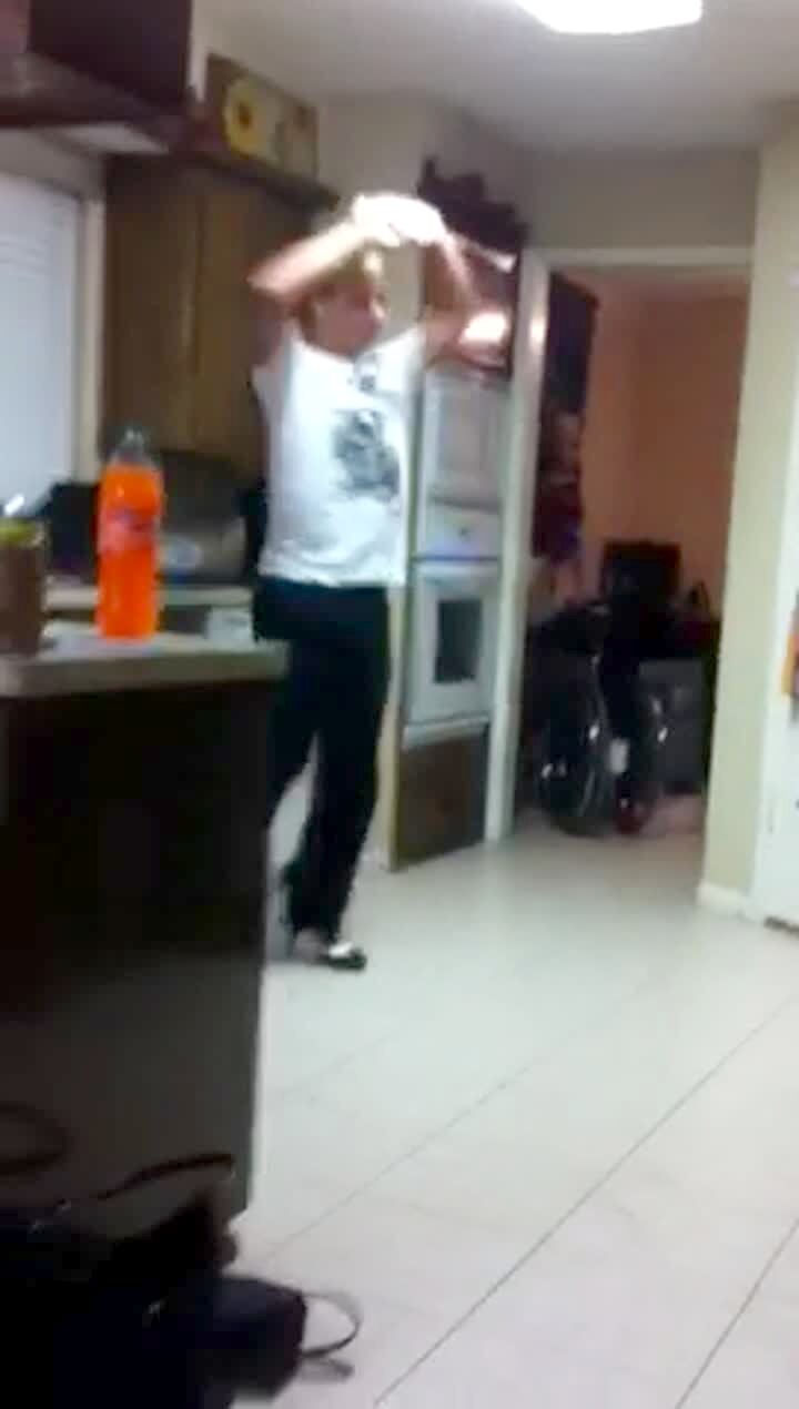 Teen boy dances on bar in the kitchen, he tries to jump to the opposite counter, he falls and hits microwave. Bonehead.