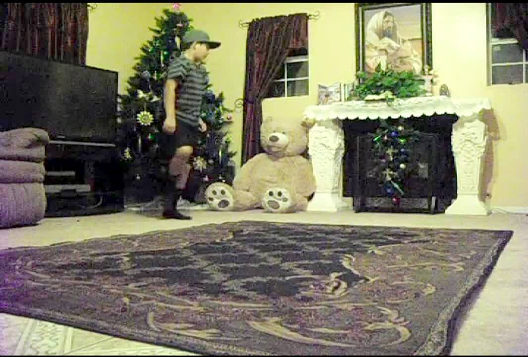 A boy dances in his room as his mom films him between a crack in his door before she crashes through his door and scares him and he screams.