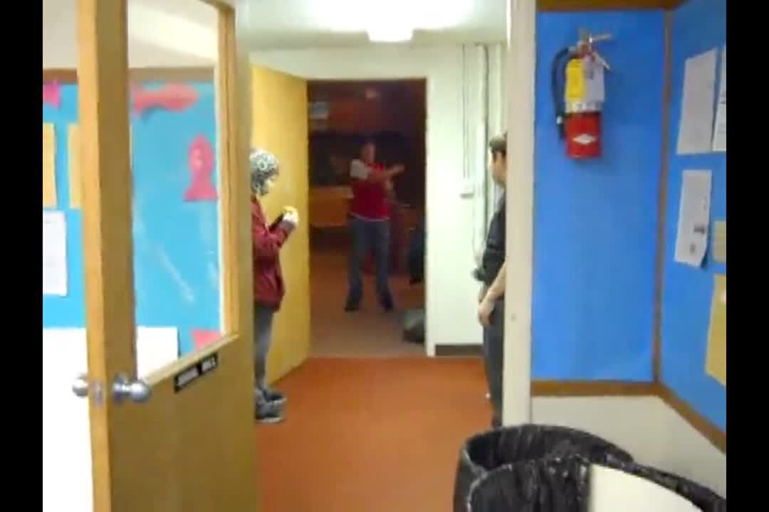 A teen boy runs through a high school hallway, jumps, and hits his head on top of the doorway on purpose. Short heads. Short tails. Bonehead.