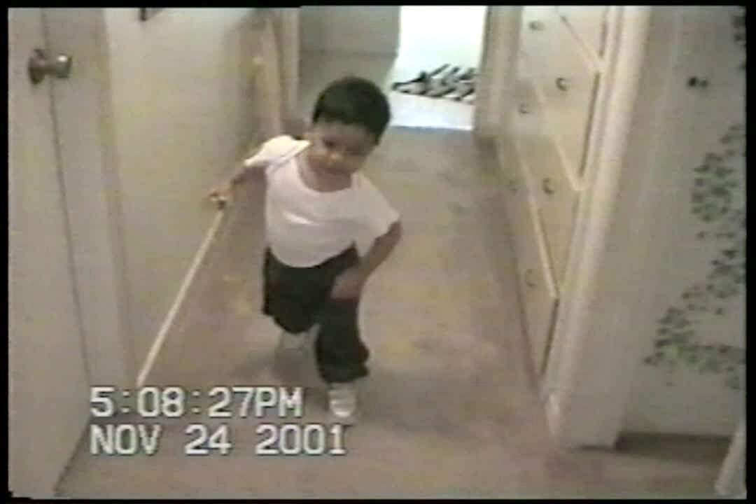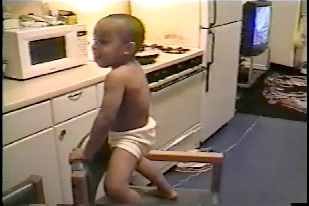Young boy dancing very well to Kris Kross (hip hop) in the house.