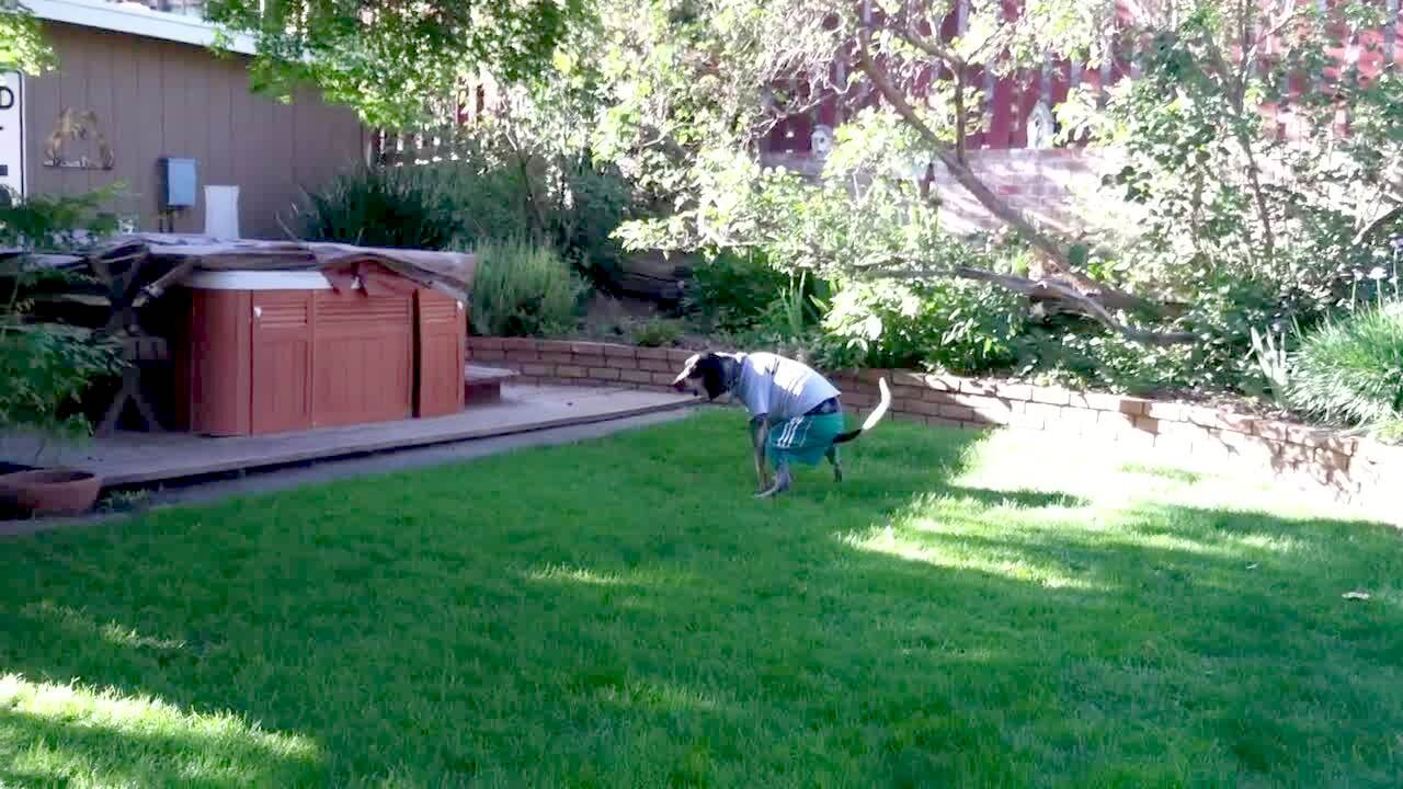 A young girl and a clothed dog play with a soccer ball outdoors. The dog poops at :37. He tries again at 1:34 but it gets caught in his shorts.