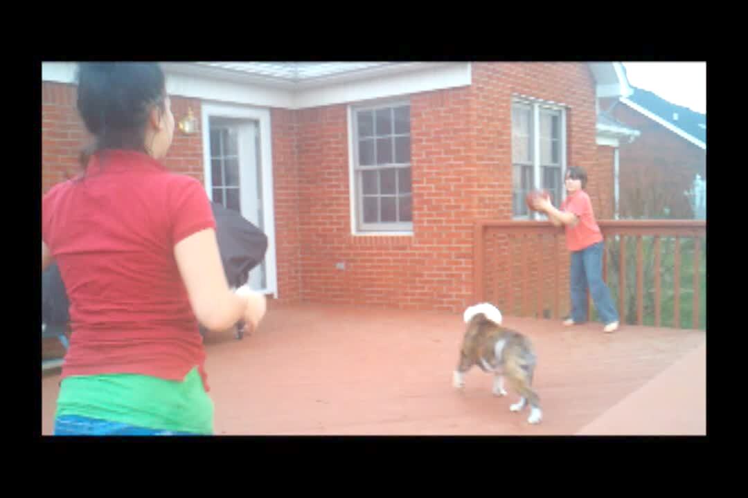A boy and a girl play with a ball on a porch while a bull dog plays monkey in the middle. The boy bounces the ball and the dog tries to do a back flip to catch it. Unable to flip, the dog lands on his back before getting up.