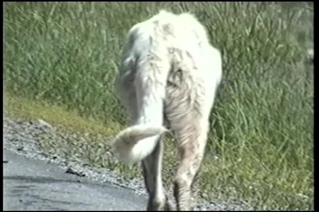 Sheep dog on road next to a car. Guys in car slow down to look at dog and it barks and jumps towards the passenger / cameraman.