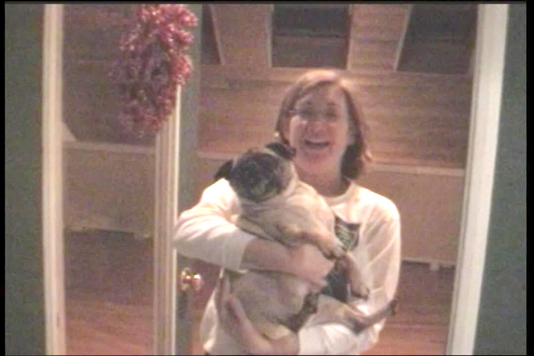 Pug dog looks funny when woman asks if he wants to go for a walk. Dog has his tongue sticking out & makes strange noises.