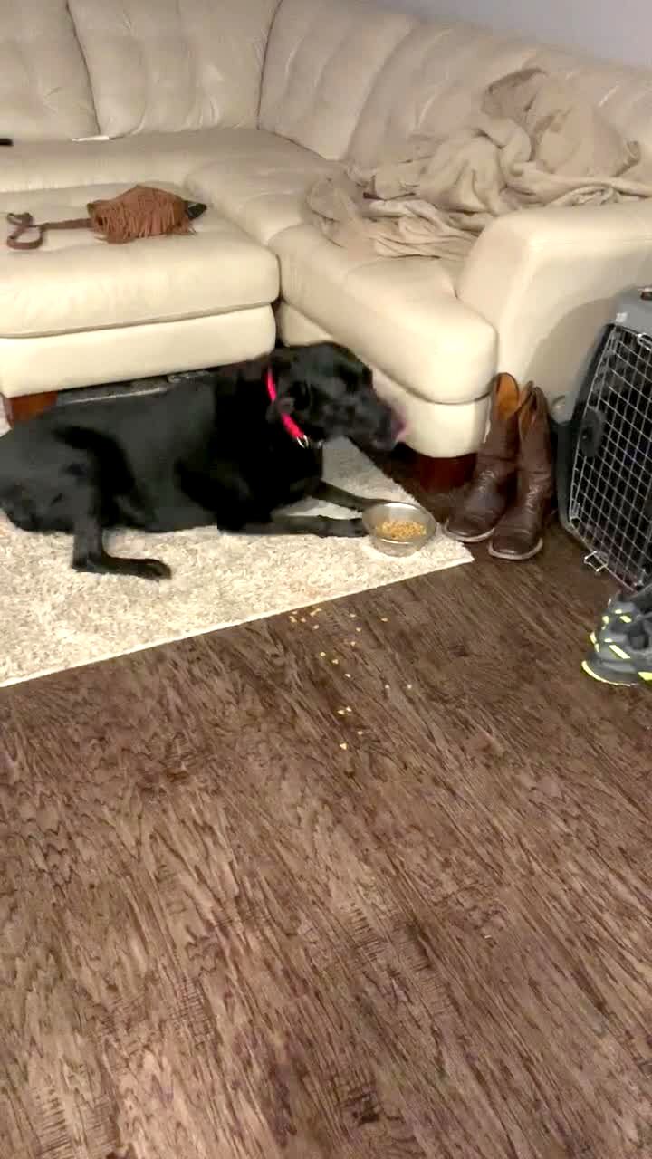 A young girl stands on a bucket to get into food on a shelf when she realizes she is on camera she slowly bends back down then falls between the bucket and the wall.