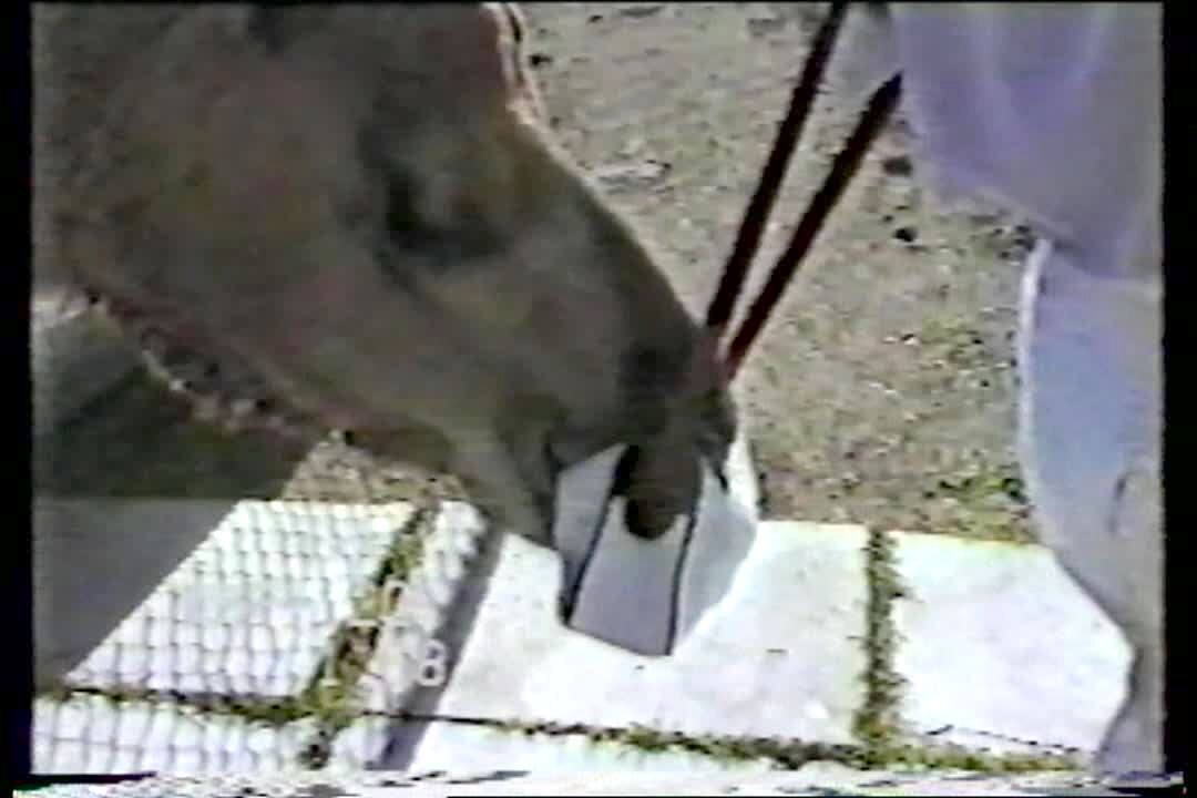 A family drives through a safari park and a man holds a bucket of animal food and a camel sticks its head through the window and bites the bucket. The man wrestles with the camel and the bucket snaps and food sprays all over the car. It sounds like the man might say "shit" at the end.