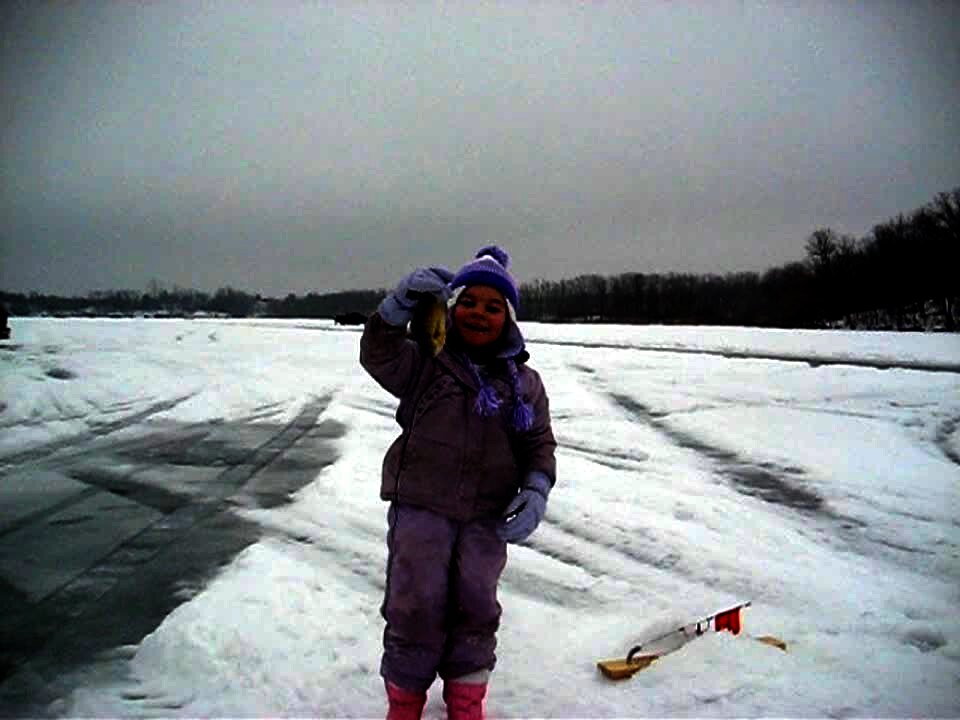 Young girl holds small fish she caught while ice fishing. Mom asks her questions, girl says "Take the damn picture."