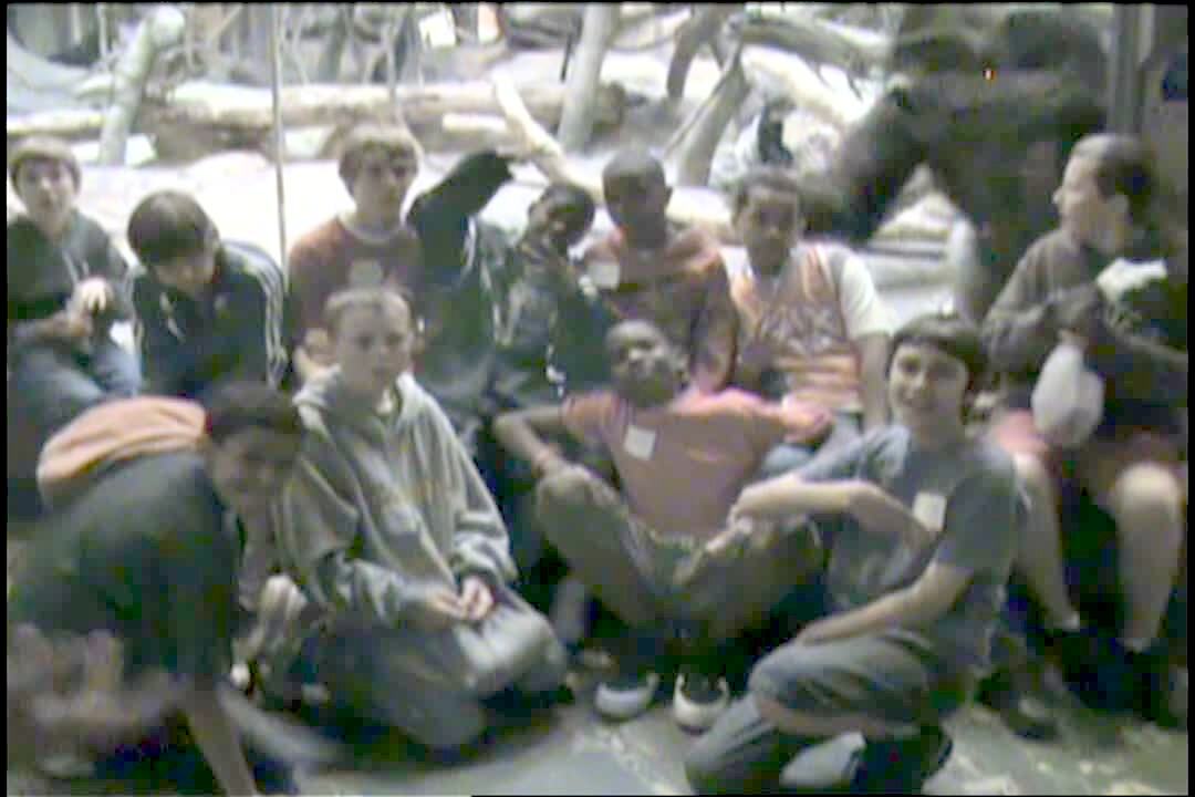 Group of kids pose in front of primate exhibit at the zoo. A Gorilla comes and bangs on the glass while the kids are taking the picture, they get scared. School trip.
