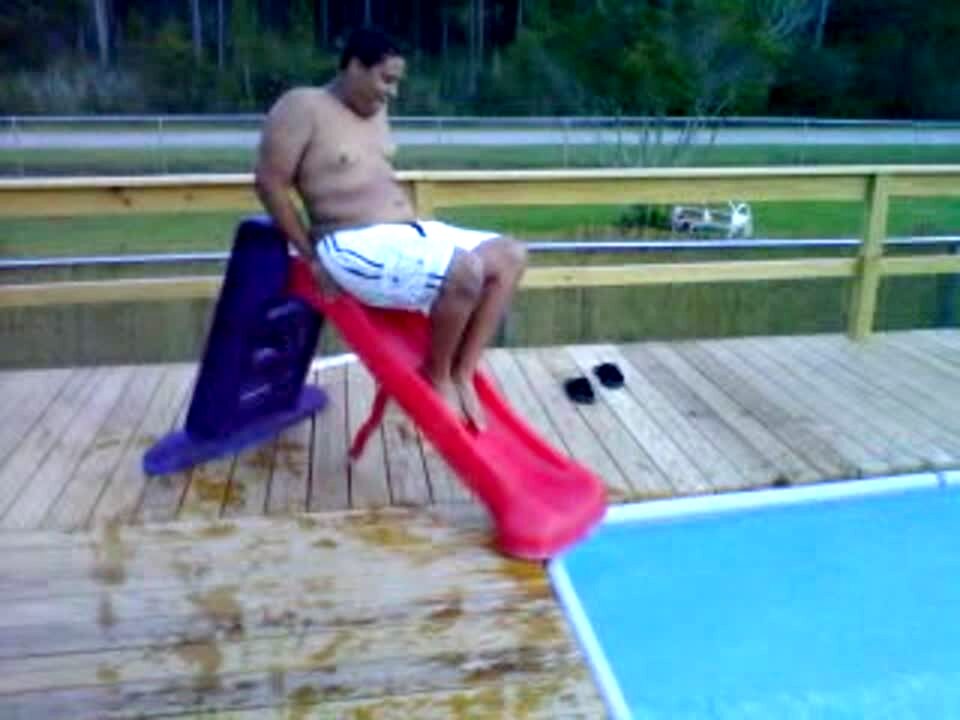 A man slips on a kid's pool slide and lands on the ground next to the swimming pool.
