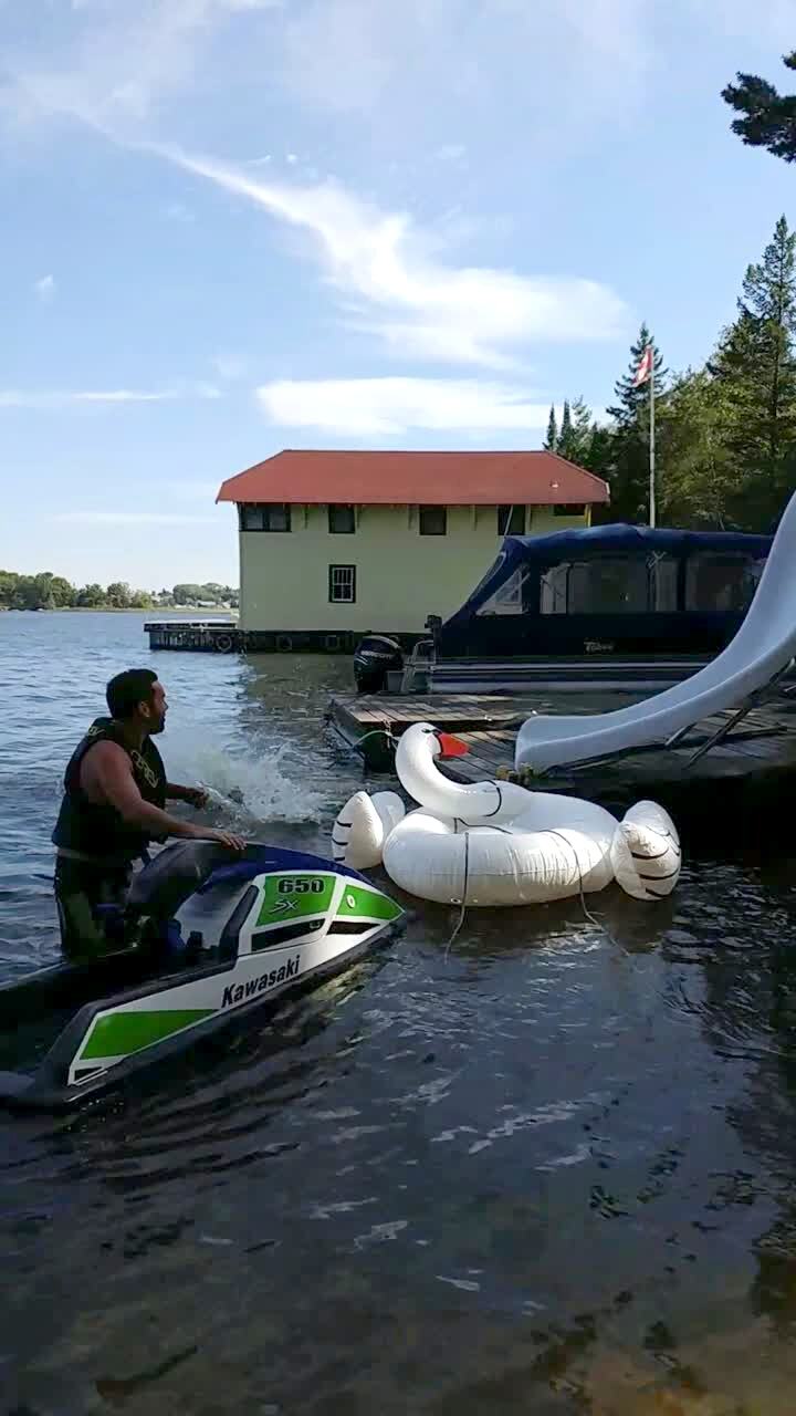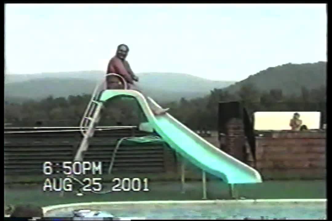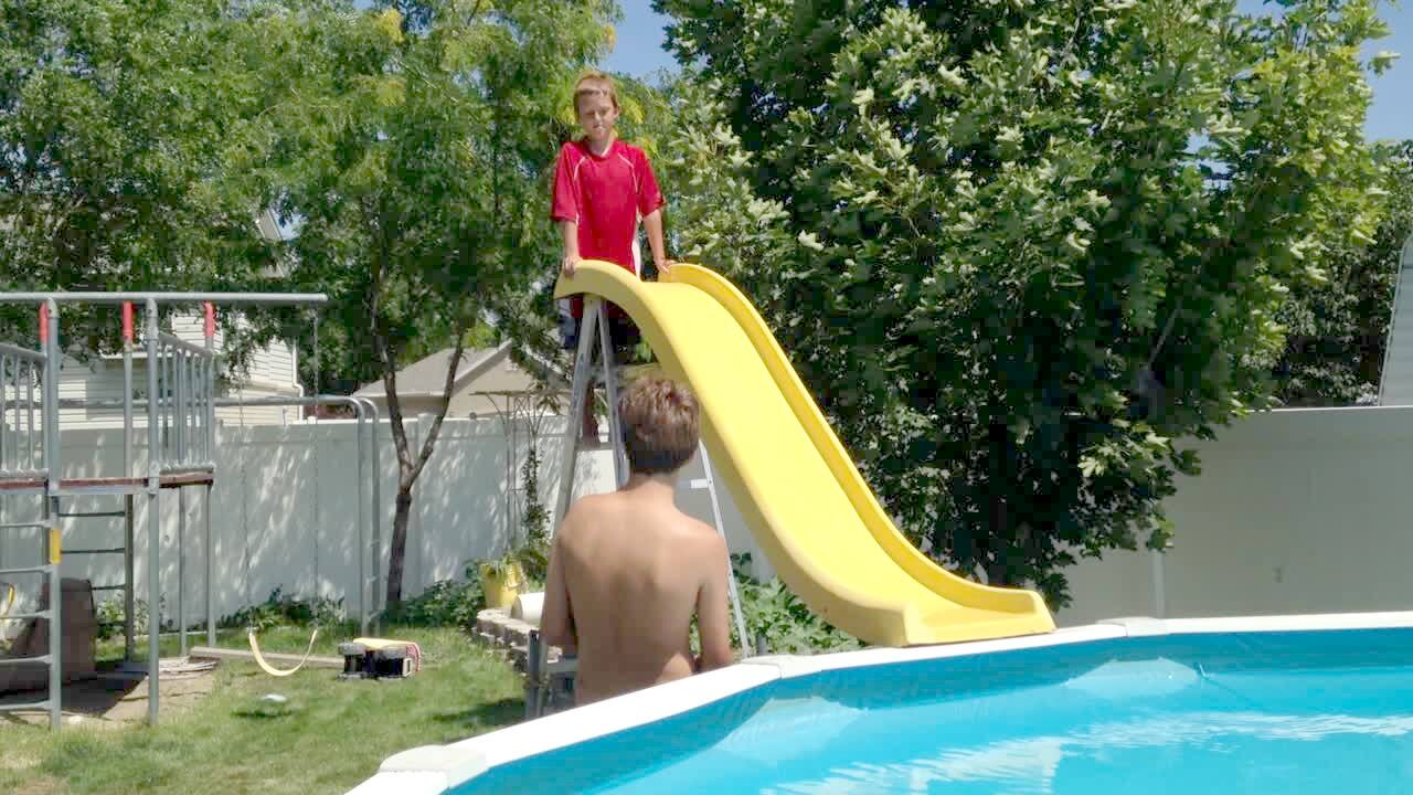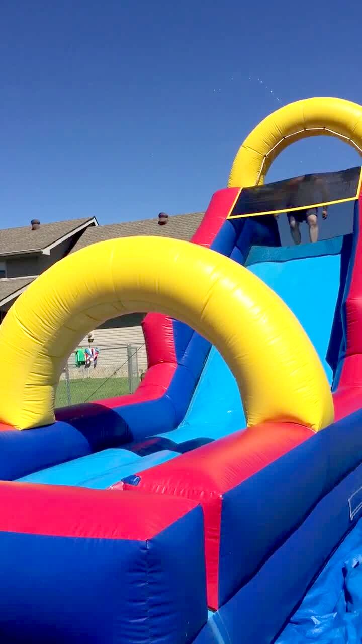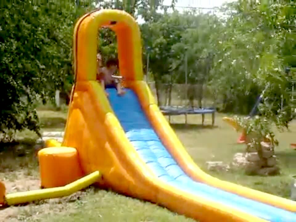 A man rides down a bounce slide and bounces at the bottom by the kiddie pool and crashes through the wall and runs through the yard and crashes into the fence and breaks it.