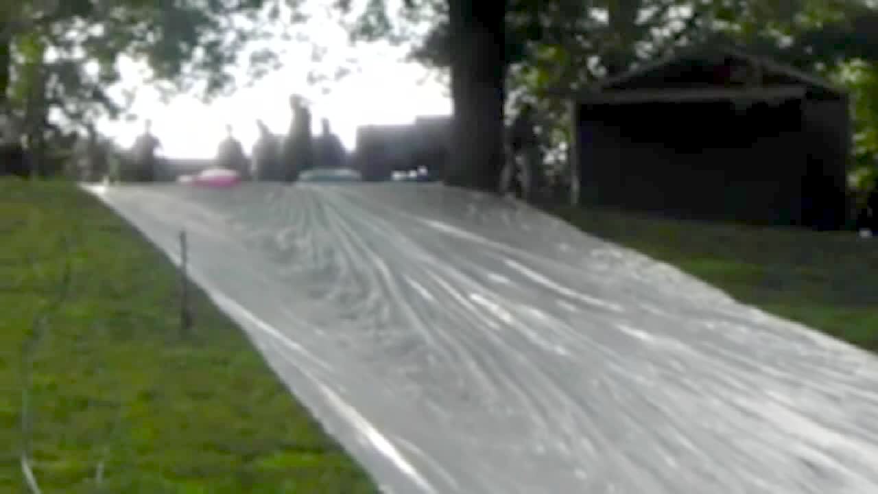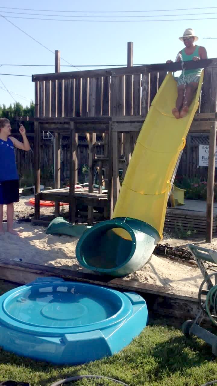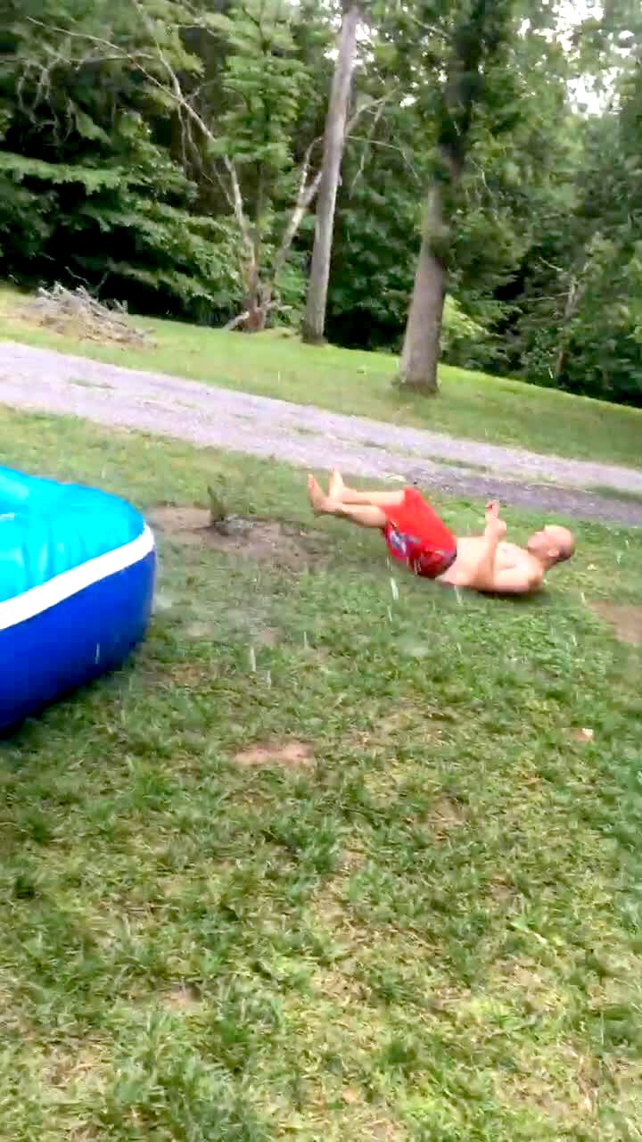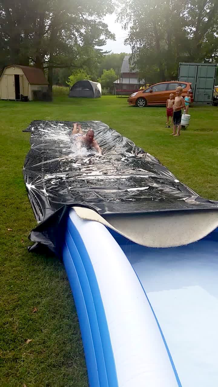 Man falls head first down backyard water slide. Man at the bottom falls awkwardly into the grass. That man also gets hit in the face by rope that springs back from a kid sliding. Man falls down steps and almost knocks over children.