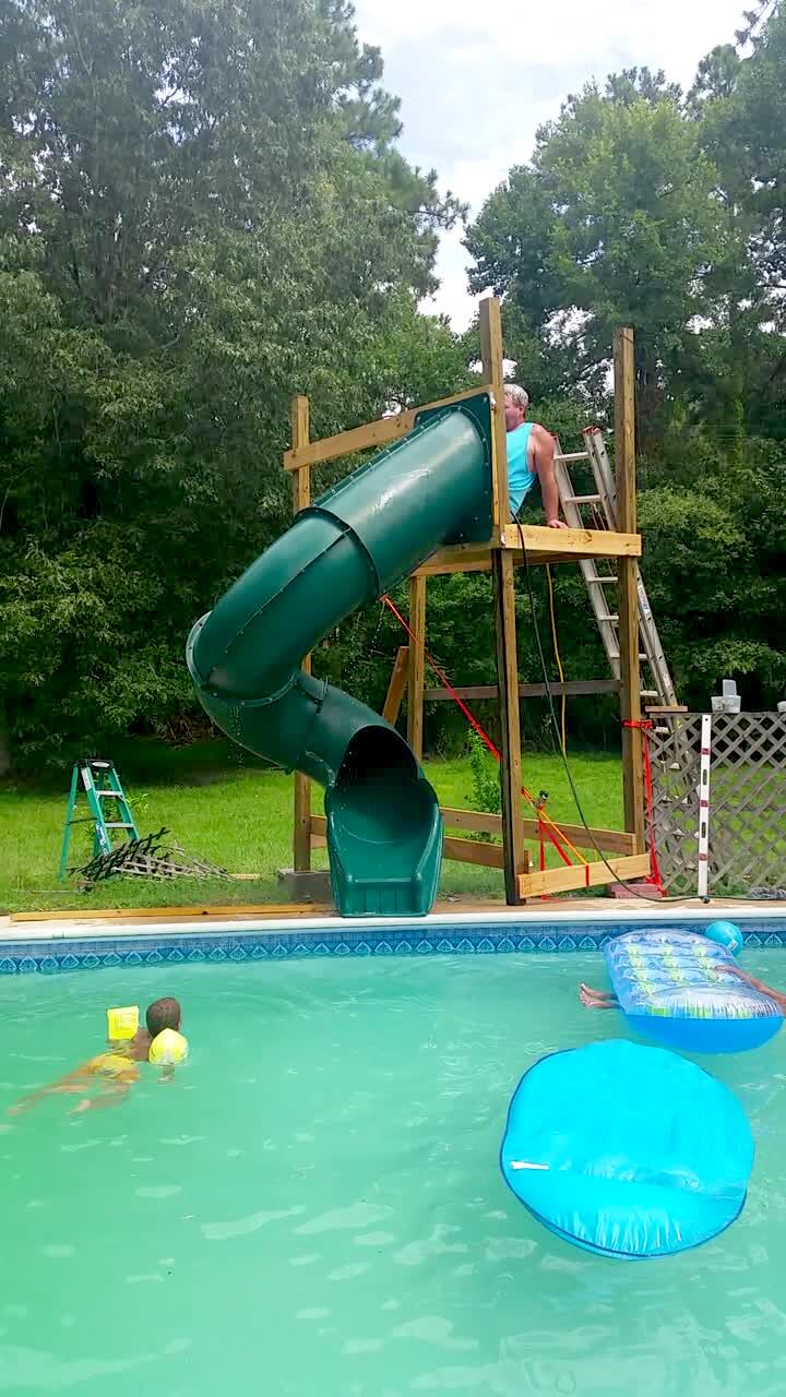 A spiral slide falls over beside a swimming pool when a man goes down the slide.