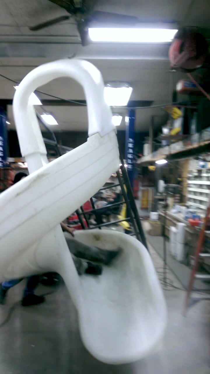 A man goes down a water slide he built in a warehouse indoors but the slide is not bolted down and tips over before he reaches the floor.
