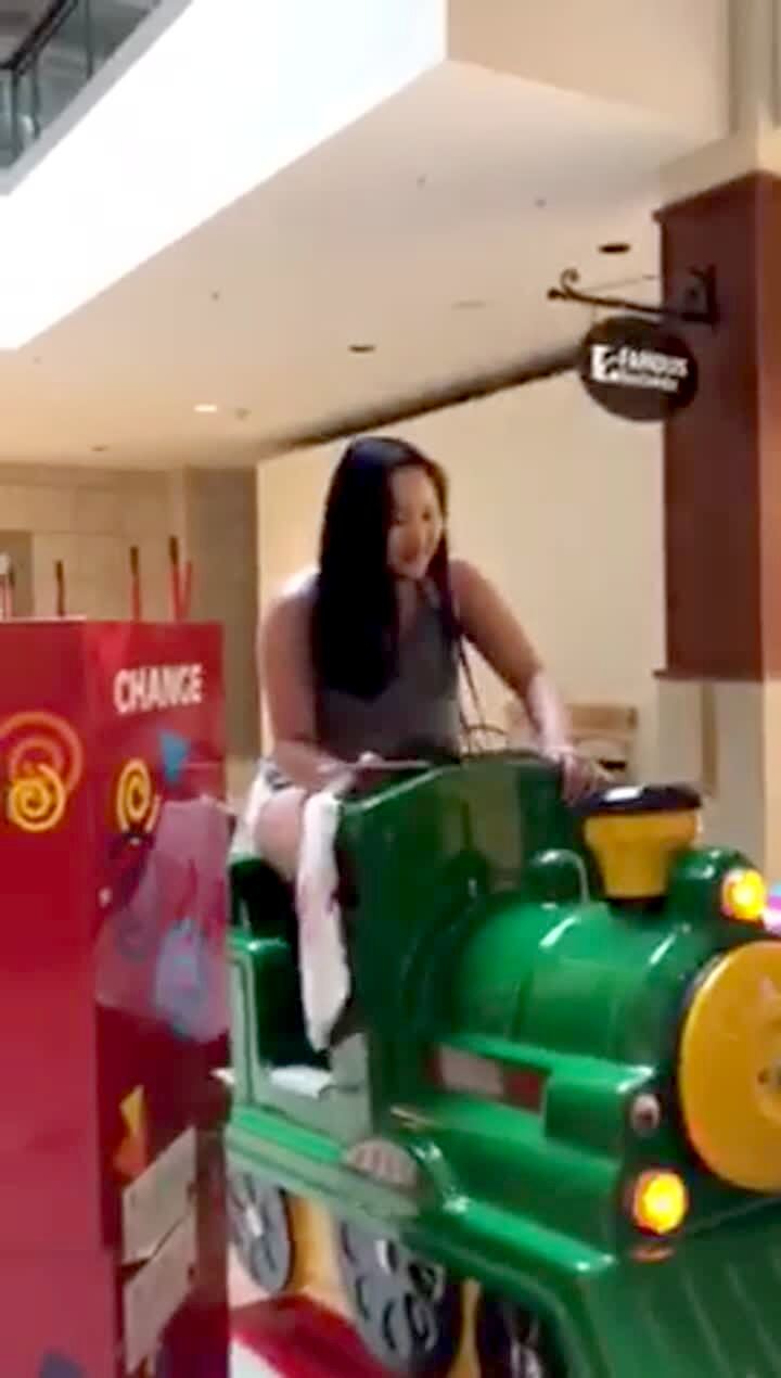 An adult woman rides a train at a mall, which tips backwards and falls.