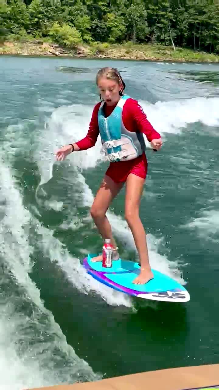 A young girl surfs behind a boat and tries to catch a juice bottle, but she drops it and it lands upright on her board.