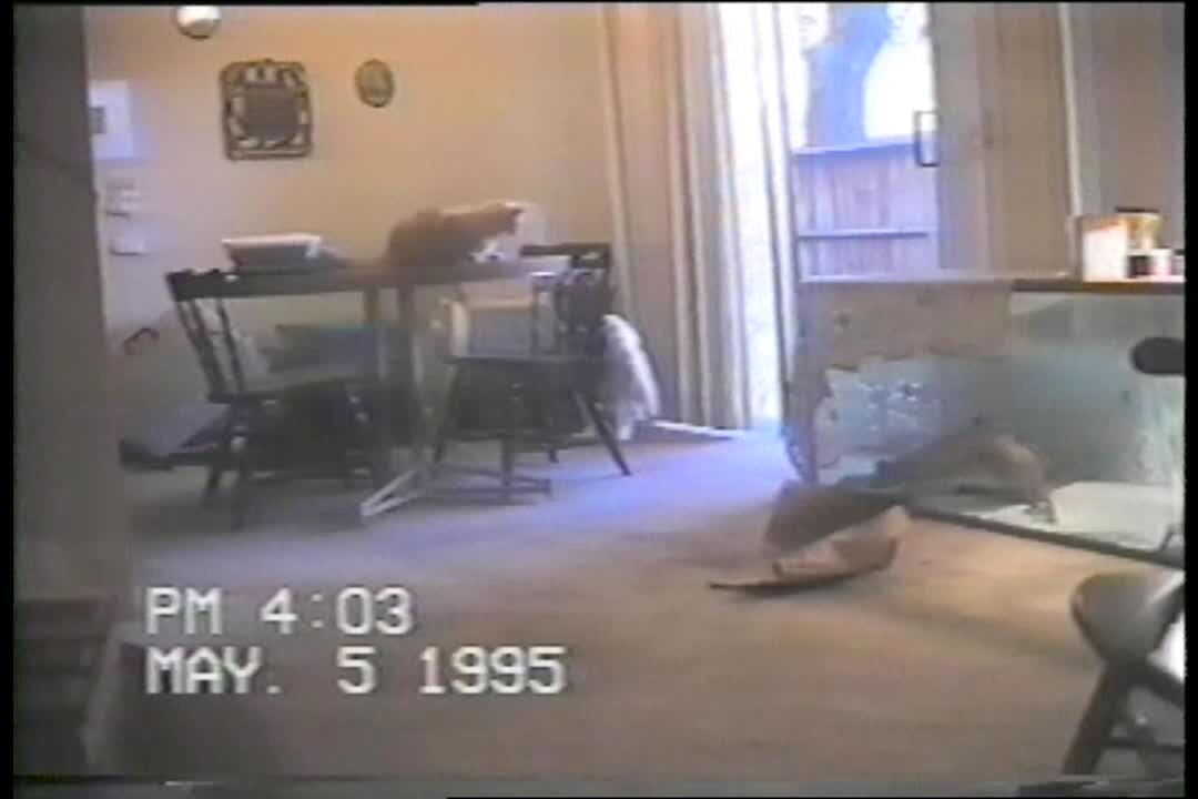 Cockatoo bites cat's tail; cat freaks