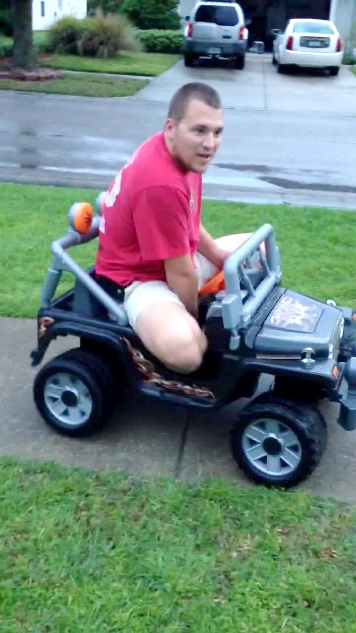 A man attempting ticks on a kids power wheels toy on the side walk falls over backwards.