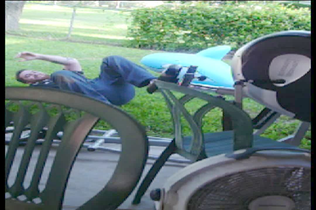 Man rides an elliptical machine on the backyard porch very quickly, the machine breaks & he falls down.