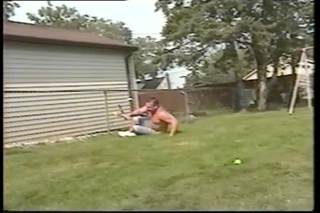 Man tries to balance on unicycle on obstacle course in back yard, falls hard. .