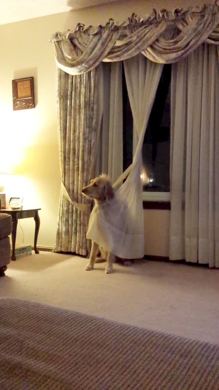 A Goldendoodle dog is trapped in curtains at home and breaks them while trying to get free.