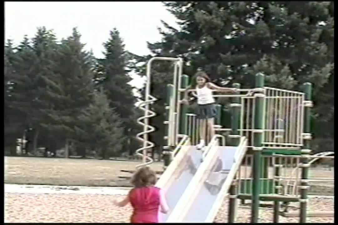 A tot girl falls in the backyard when her tot sister pushes her down a slide.