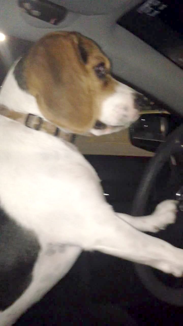 A Beagle dog honks the horn of a car to encourage his owner to hurry back.