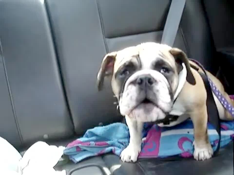 Bulldog puppy makes cute sound to ask for another treat in the back seat of a car. Unusual.