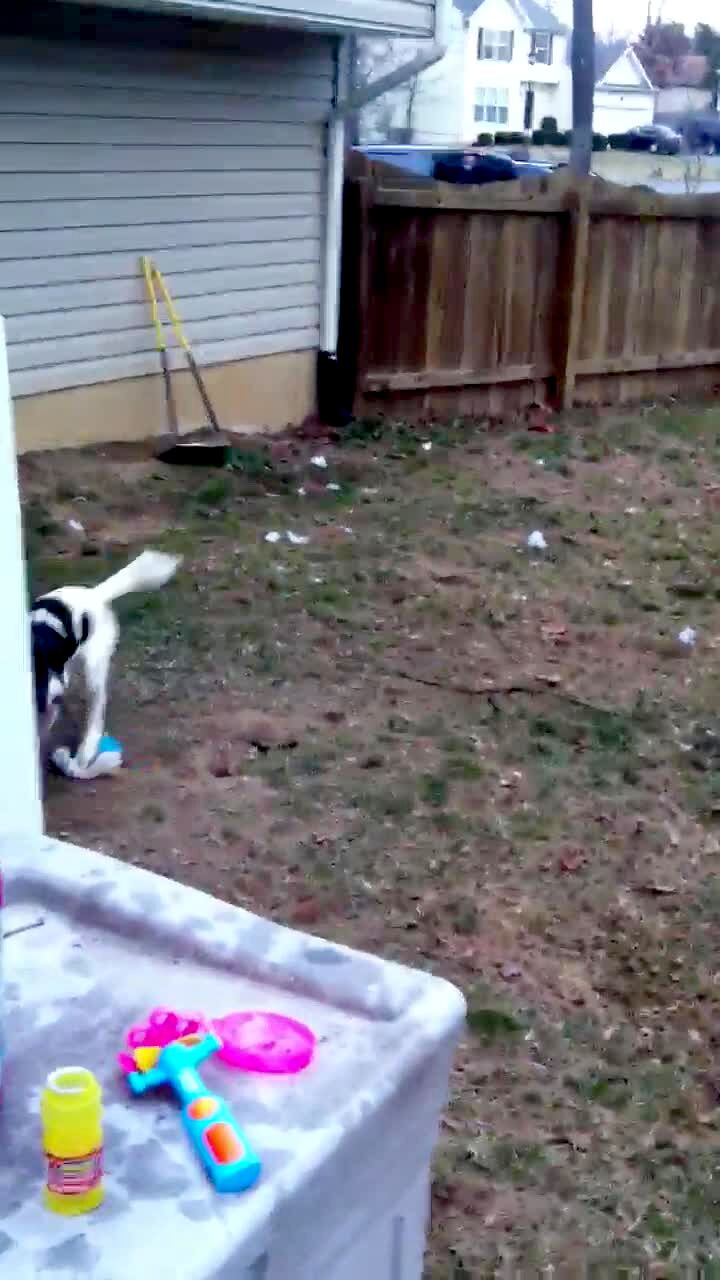 A dog jumps for bubbles outside and knocks over a seven year old girl.