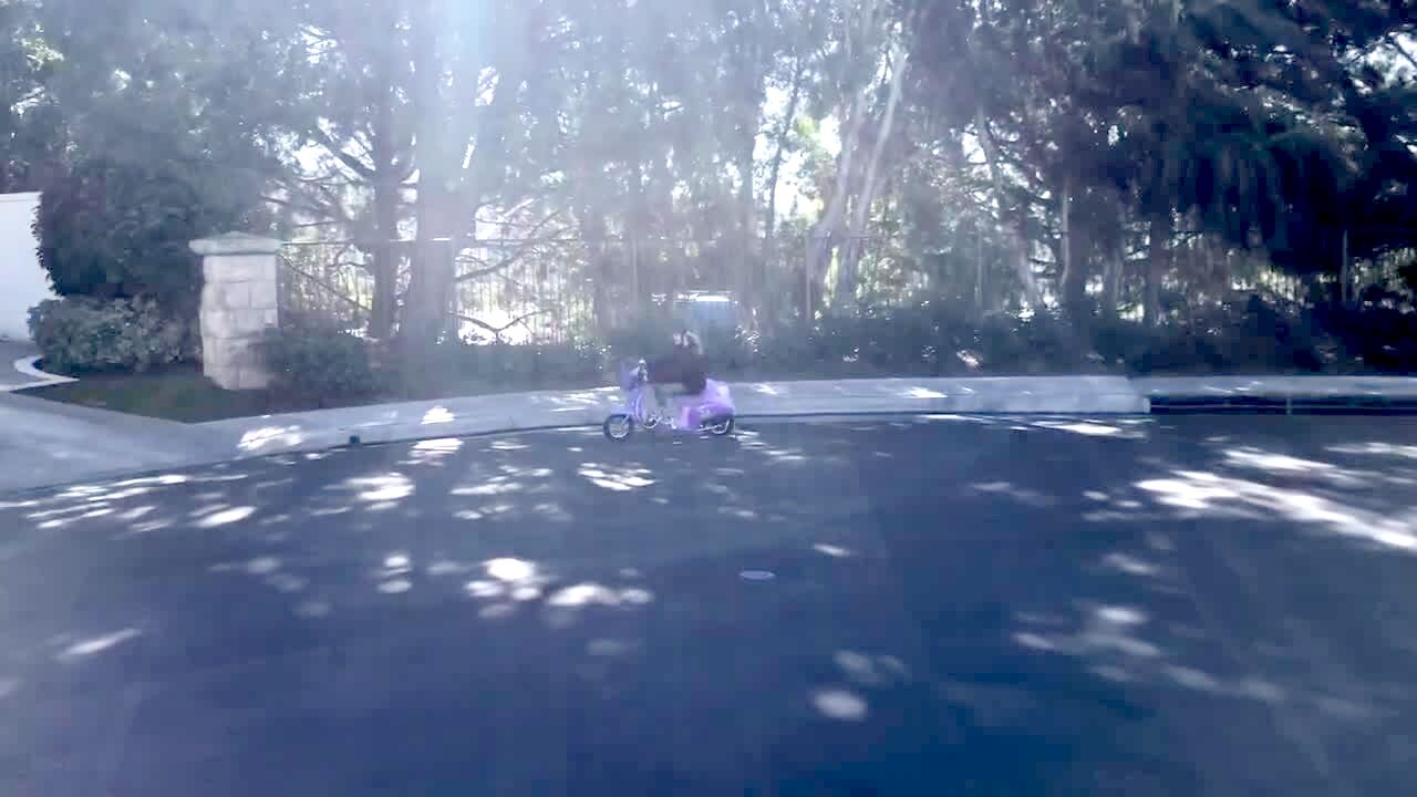 A tot girl rides a Power Wheels car outdoors and chases a boy. She runs over him.