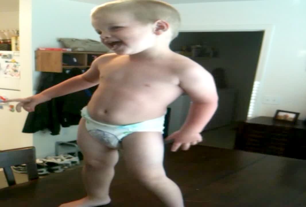 Tot boy dances in only a diaper on table while singing, "This is for the wadies, yeah yeah."