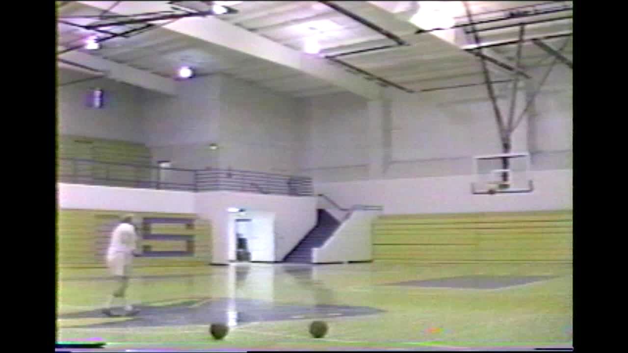 Man kicks ball thru basket, is triumphant then trips over his own two feet, falls.