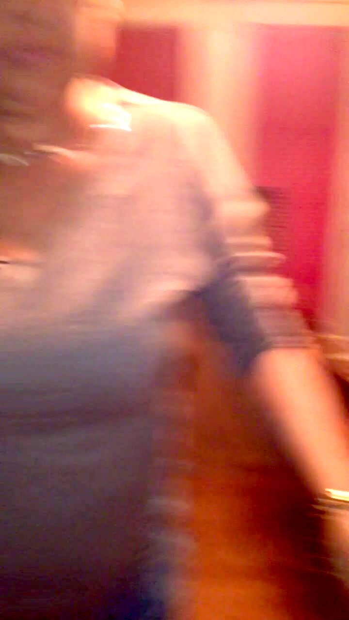 A woman falls off a stool at a bar when she loses her balance while she spins around in circles on it with her legs in the air.