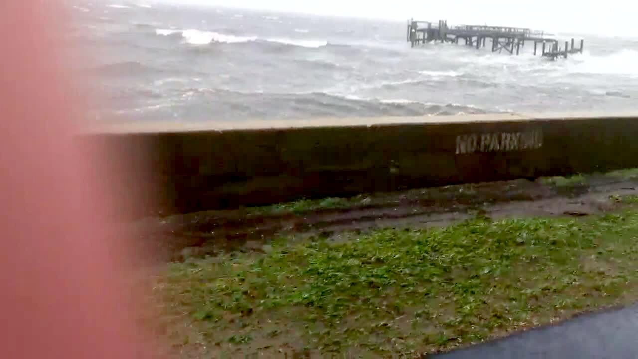 A woman walks up the front porch stairs with a dog and a bunch of winter/snow falls down on them. Home security footage