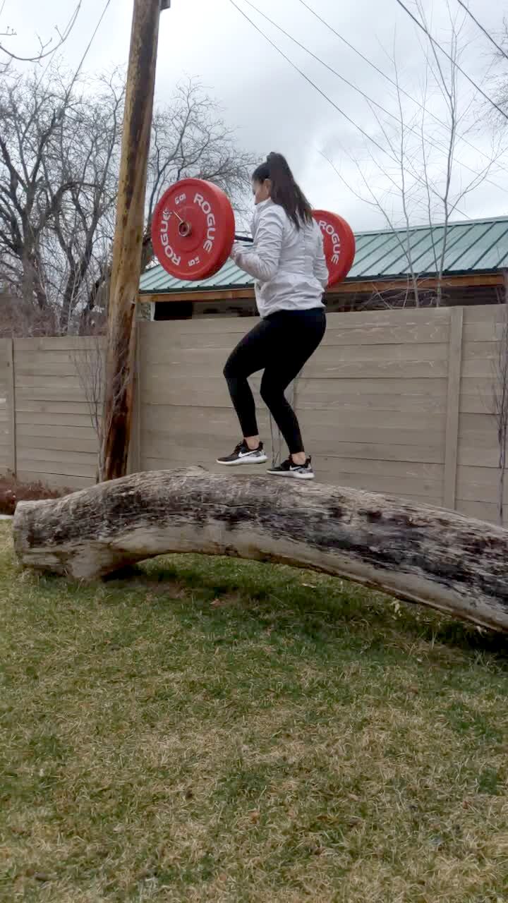 A woman falls in slow motion while she walks across a fallen tree in a yard as she carries a barbell.