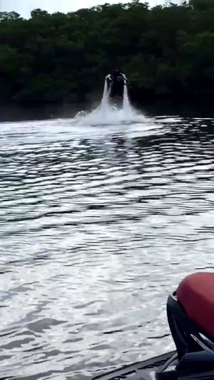 A man flies above the water on hydro-jet boots and tries to do a backflip but face plants in the water on the lake.