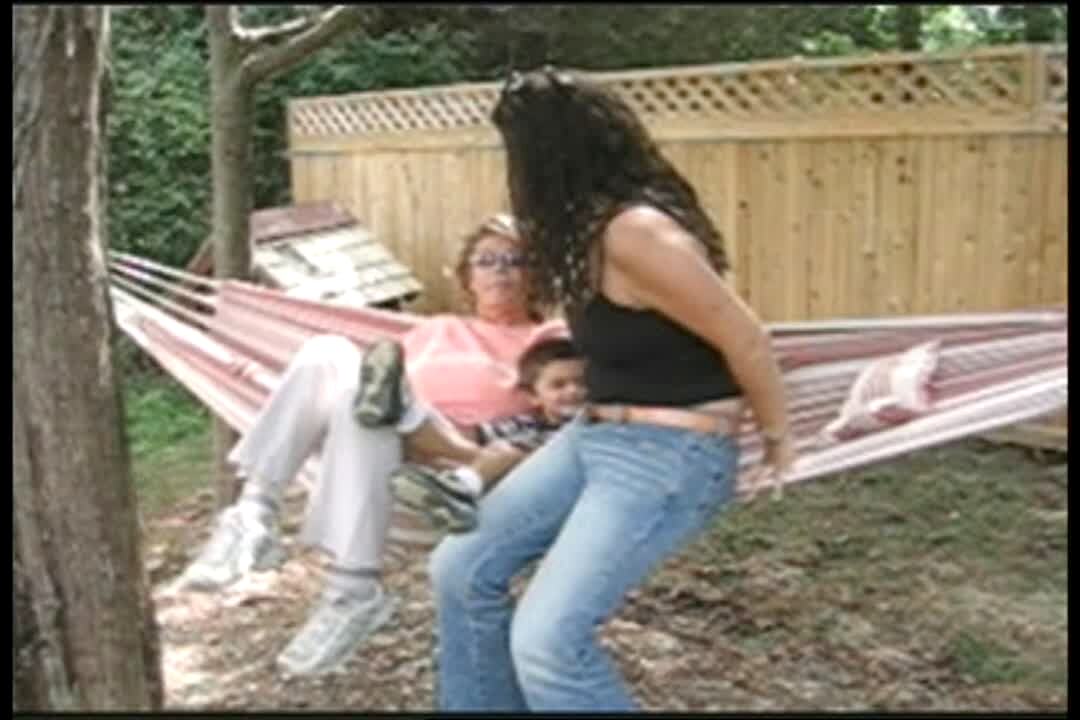 A woman. struggles to climb onto a hammock at a park and falls off. A teen boy and another woman grab her hands and help her up. A teen girl goes to sit on the hammock, but misses it entirely and falls on the ground.