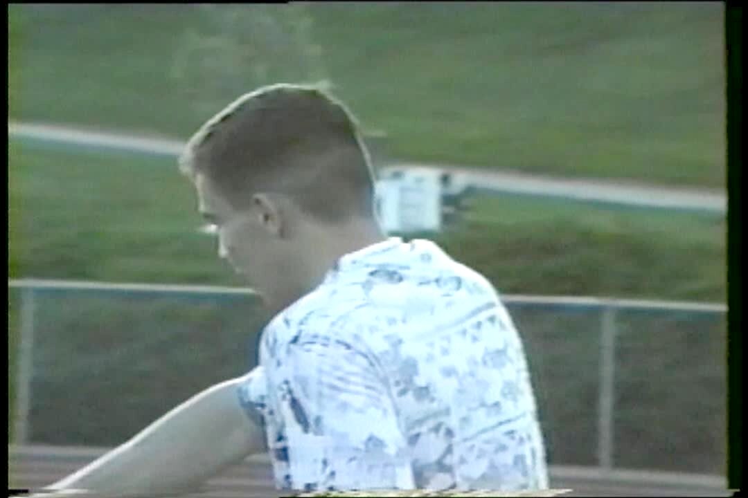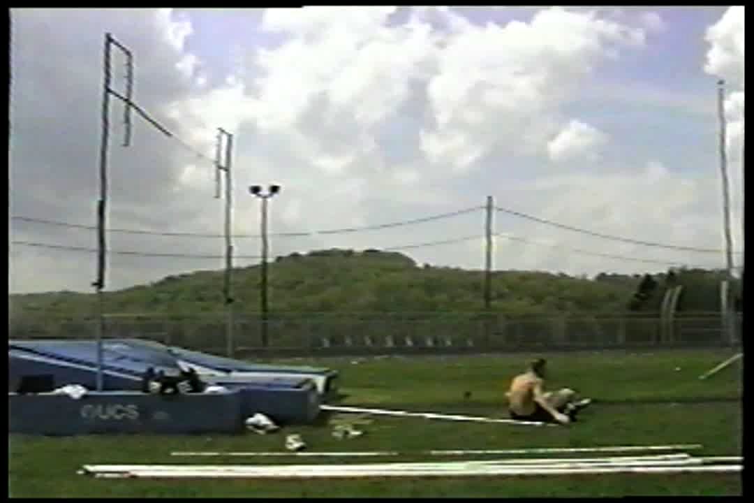 A teen boy jumps a hurdle on an outdoor high school track. Another teen boy tries to jump over the hurdle, hits his crotch on the hurdle and the hurdle cracks and breaks. Camera jerks away and shuts off during impact. No tails.
