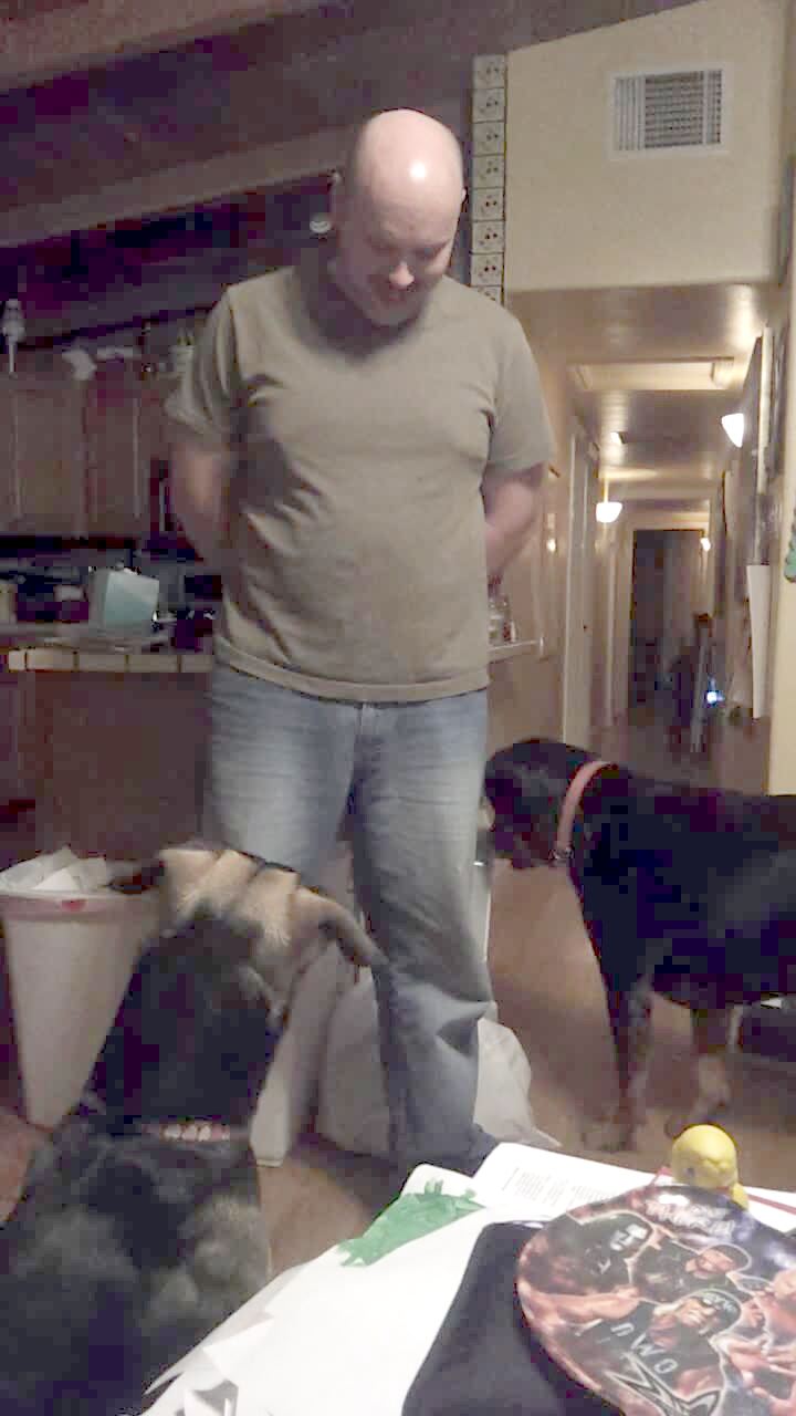 A man stands in a living room at night while two dogs watch a red laser on his body. The woman behind the camera controls the laser and points it to the man's crotch. One of the dogs tries to bite the laser on his crotch and the man gets upset. The woman behind the camera laughs hard. Short tail.